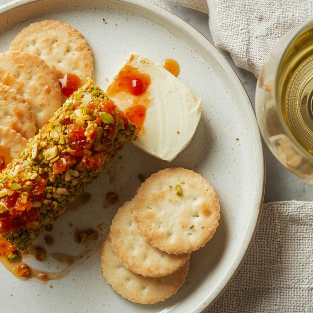 Chevre Log with Crushed Toasted Pistachios & Pepper Jelly: Pre-heat oven to 325°. Chop a handful of shelled pistachios and place onto a baking sheet. Toast in oven for 7-10 min or until they smell fragrant; don’t overcook. Roll chevre log onto chopped pistachios to coat the log. In a small bowl, warm 1/4-1/2 c. Pepper Jelly in microwave with perhaps 1Tbs water. warm in short bursts until the jelly thins out a bit. Once to a desired consistency, pour evenly over pistachio-crusted chevre and serve with crackers.