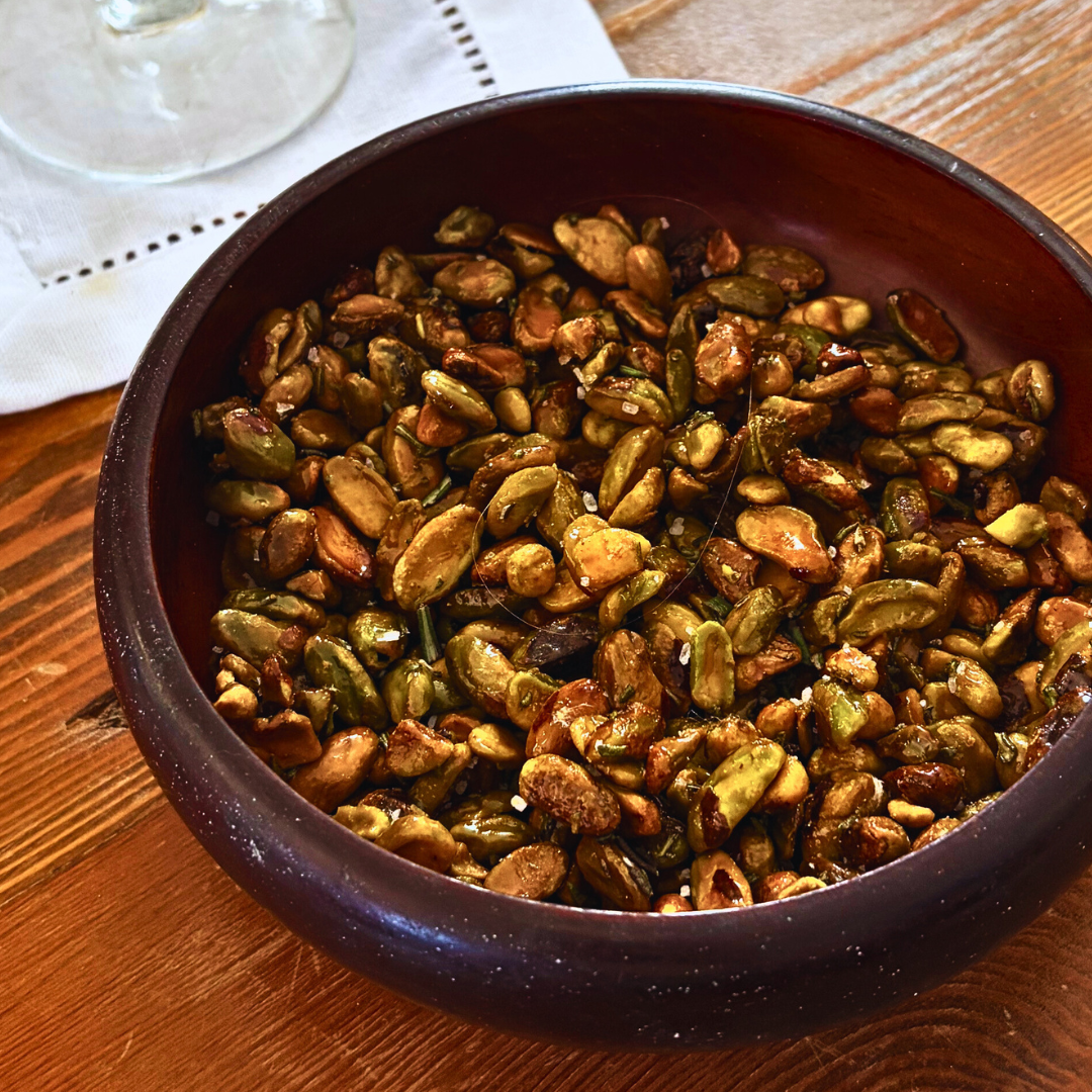Hot Honey & Rosemary Roasted Pistachios: Preheat oven to 325°. In a small bowl, toss a handful or two of shelled pistachios with 2 Tbs or so of hot honey. Add 1-2 Tbs minced fresh rosemary and stir to coat evenly. Lightly oil a baking sheet and spread the pistachio mixture into a single layer onto the sheet. Bake for 8 minutes. Pull from oven, move onto cooled, lightly oiled plate, and top with a generous sprinkle of flake salt. Allow to cool so that they crisp nicely (will only take a few minutes) and transfer to a serving bowl.