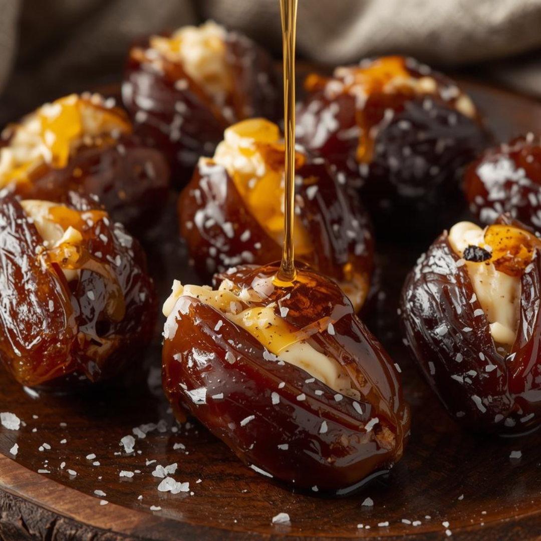 Chevre-Stuffed Dates with Hot Honey: Preheat oven to 375°. Slice each date from end to end on one side only to create a pocket. Stuff each date with chevre. Drizzle with Hot Honey and place in a lightly oiled baking dish. Bake for 8-10 min. or until chevre begins to bubble. Sprinkle with flake salt and serve warm.